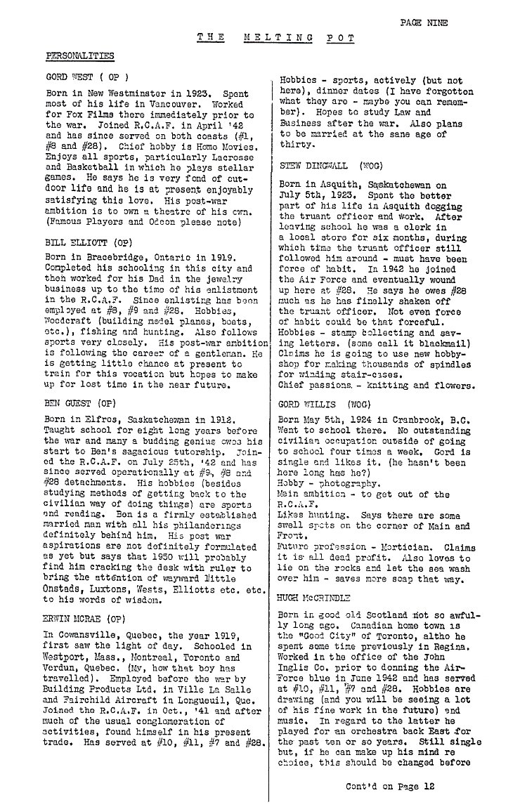 “Artificial respiration be blowed,” said the man, excitedly, “you’ll give her the real thing. I’ll pay for it.” We don’t know yet how this issue will look when it returns from Alliford Bay - in case you don’t know it we owe Alliford Bay a lot in connection with the P.P.N. If a copy turns out good a lot of the credit is theirs. But a lot of it also belongs to the 28ers who cut the stencils. Stencil cutting is not as easy as one would suppose, as anyone who has ever cut a stencil knows - especially with the temperamental typewriter we have. However we got these few words together to thank the chaps who cut the stencils for this issue so we might as well get at it. Our sincerest thanks to Al Lucas (1) and Jack MacDonald, who spent their days off and their spare time to work on the Paper. We want to let you know that we appreciate it. [‘Editors’ note 2003: #10 - Cape Scott; #13 - Amphitrite (Ucluelet); #26 - Langara; #33 - Tofino.] GORD WEST (OP) Born in New New Westminster in 1923. Spent most of his life in Vancouver. Worked for Fox Films there immediately prior to the war. Joined R.C.A.F. in April ’42 and has since served on both coasts (#1, #8 and #28). Chief hobby is Home Movies. Enjoys all sports, particularly Lacrosse and Basketball in which he plays stellar games. He says he is very fond of outdoor life and he is at present enjoyably satisfying this love. His post-war ambition is to own a theatre of his own. (Famous Players and Odeon please note.) BILL ELLIOTT (OP) Born in Bracebridge, Ontario in 1919. Completed his schooling in this city and then worked for his Dad in the jewelry business up to the time of his enlistment in the R.C.A.F. since enlisting has been employed at #8, #9 and #28. Hobbies, Woodcraft (building model planes, boats, etc.) fishing and hunting. Also follows sports very closely. His post-war ambition is following the career of a gentleman. He is getting little chance to train for this vocation but hopes to make up for lost time in the near future. BENGUEST (OP) Born in Elfros, Saskatchewan in 1912. Taught school for eight long years before the war and many a budding genius owes his start to Ben’s sagacious tutorship. Joined the R.C.A.F. on July 25th, ’42 and has since served operationally at #9, #8 and #28 detachments. His hobbies (besides studying methods of getting back to the civilian way of doing things) are sports and reading. Ben is a firmly established married man with all this philanderings definitely behind him. His post-war aspirations are not definitely formulated as yet but says that 1950 will probably find him cracking the desk with ruler to bring the attention of wayward little Onstads, Luxtons, Wests, Elliotts etc. etc. to his words of wisdom. ERWIN McRAE (OP) In Cowansville, Quebec, the year 1919, first saw the light of day. Schooled in Westport, Mass., Montreal, Toronto and Verdun, Quebec. (My, how that boy has traveled). Employed before the war by Building Products Ltd. In Ville La Salle and Fairchild Aircraft in Longueil, Que. Joined the R.C.A.F. in Oct., ’41 and after much of the usual conglomeration of activities, found himself in his present trade. Has served at #10, #11, #7 and #28. Hobbies - sports, actively (but not here). Dinner dates (I have forgotten what they are - maybe you can remember). Hopes to study law and Business after the war. Also plans to be married at the sane age of thirty. STEW DINGWALL (WOG) Born in Asquith, Saskatchewan on July 5th, 1923. Spent the better part of his life in Asquith dodging the truant officer and work. After leaving school he was a clerk in a local store for six months, during which time the truant officer still followed him around - must have been force of habit. In 1942 he joined the Air Force and eventually wound up here at #28. he says he owes #28 much as he has finally shaken off the truant officer. Not even force of habit could be that forceful. Hobbies - stamp collecting and saving letters. (Some call it blackmail) Claims he is going to use new hobby-shop for making thousands of spindles for winding stair-cases. Chief passions - knitting and flowers. GORD WILLIS (WOG) Born May 5th, 1924 in Cranbrook, B.C. Went to school there. No outstanding civilian occupation outside of going to school four times a week. Gord is single and lies it. (he hasn’t been here that long has he?) Hobby - photography. Main ambition - to get out of the R.C.A.F. Likes hunting. Says there are some swell spots on the Corner of Main and Front. future profession - Mortician. Claims it is all dead profit. Also loves to lie on the rocks and let the sea wash over him - saves more soap that way. HUGH McCRINDLE Born in good old Scotland not so awfully long ago. Canadian home town is the “Good City” of Toronto, although he spent some time previously in Regina. Worked in the office of the John Inglis Co. prior to donning the Air Force blue in June 1942 and has served at #10, #7 and #28. Hobbies are drawing (and you will be seeing a lot of his fine work in the future) and music. In regard to the latter he played for an orchestra back East for the past ten or so years. Still single but, if he can make up his mind re choice, this should be changed before very long. CONTINUED ON PAGE 12 [‘Editor 2003: #1 - Preston, N.S.; #7 - Pat Bay, BC; #8 - Sea Island, BC; #9 - Spider Island, BC; #10 - Cape Scott, BC; #11 - Ferrer Pt., BC; #28 - Cape St. James, BC!]