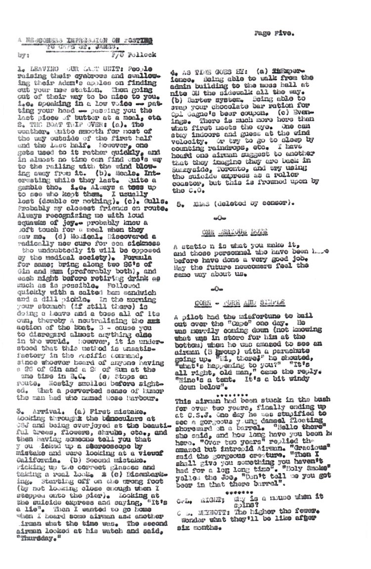 1. LEAVING YOUR LAST UNIT: People raising their eyebrows and swallowing their Adam's apples on finding out your new station. Then going out of their way to be nice to you, ie speaking in a low voice - patting your head - passing you the last piece of butter at a meal, etc.2. THE BOAT TRIP OVER: (a). The weather. Quite smooth for most of the way outside of the first half and the last half. However, one gets used to it rather quickly, and in almost no time can find one's way to the railing with the wind blowing away from it. (b) Meals. Interesting while they last. Quite a gamble though, ie, Always a toss up to see who kept them. I usually lost (double or nothing). (c) Gulls. Probably my closest friends on route. Always recognizing me with loud squawks of joy. - probably know a soft touch for a meal when they saw me. (d)Medical. Discovered a radically new cure for sea sickness (tho indoubtedly it will be opposed by the medical society). Formula for same: bring along two 26's of Gin and Rum (preferably both), and each night before retiring drink as much as is possible. Followed quickly with a salted ham sandwich and a dill pickle. In the morning your stomach (if still there) is doing a heave and a toss all of its own, thereby - A: neutralizing the action of the boat. B: cause you to disregard almost anything else in the world. However, it is understood that this method is unsatisfactory in the Pacific Command, since whoever hear of anyone having a 26 of Gin and a 26 of Rum at the same time in B.C. (e) Stops en route. Mostly smelled before sighted. What a perverted sense of humour the man had who name Rose Harbour.