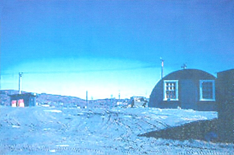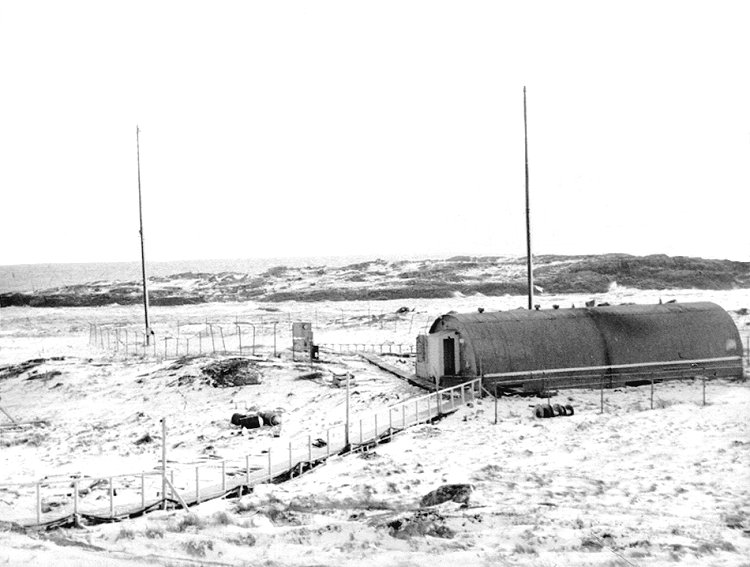 The Americans were quick to replace these with five new Quonset huts - and this time they were not connected, but side by side. There are a number of photos available on our web site that depict the replacement Quonset huts. The five buildings were used for: Officers quarters, Kitchen, Hydro area, Men's barracks, and a building that was used for recreational purposes. We have been advised that the Americans put down copper pipes 2' - 10' into the ground (even thru some graves) and they strung cable that, from the air, would look like a cobweb, then put up a fence around the whole area... a metal fence that had large square holes (about 6" squares).