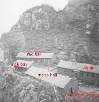 Barracks 1-4 at mid level. Lower level (1) Admin building, (4) Mess Hall, (5) Cook House, (6) DOT boathouse.