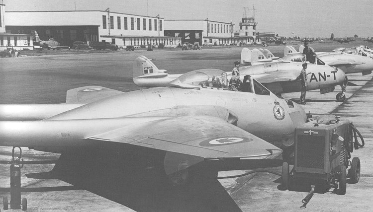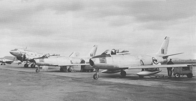 Sabre conversion was still not complete, and Sabres were still scarce. Much flying was still being done in the Yellow Peril (Harvard) at 421. April 4 USAF Sabres from Presque Isle arrived for a visit and the full Red Indian "treatment". According to the records of the day, "Despite bad weather, and equally bad heads, our friends from the south took to the air next morning on their return to Presque Isle".