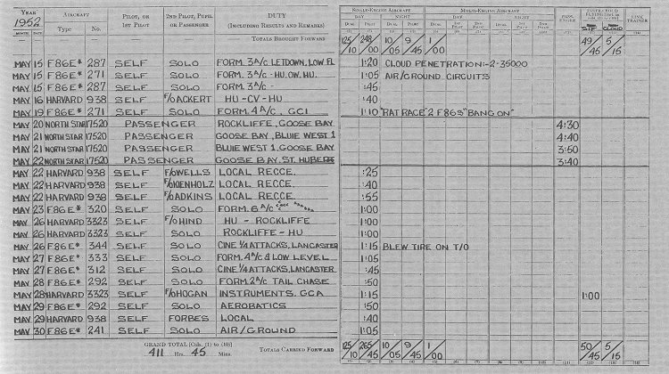 On June 3-4, 421's pilots were at the Institute of Aviation Medicine in Toronto, having flown up in a Dakota. At St. Hubert the Dak crew was astonished when a 421 prankster boarded wearing his parachute. On the return flight, the same "hot shot" drove his point home by presenting the Dak captain with an aviation insurance policy! At the IAM, the Sabre pilots were put to the test in a centrifuge with and without G-suits, to determine their tolerance. During the proceedings F/O Ralph Heard logged 9g (sans g-suit), thought to be a Canadian record at the time.