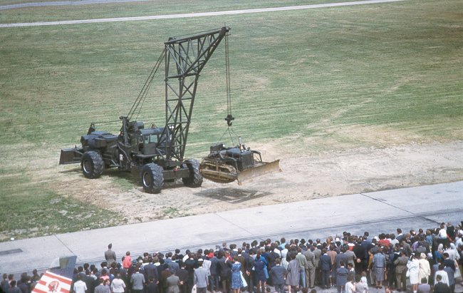 5. A crane demonstrates its capability by lifting a tractor - 7 August 1960.