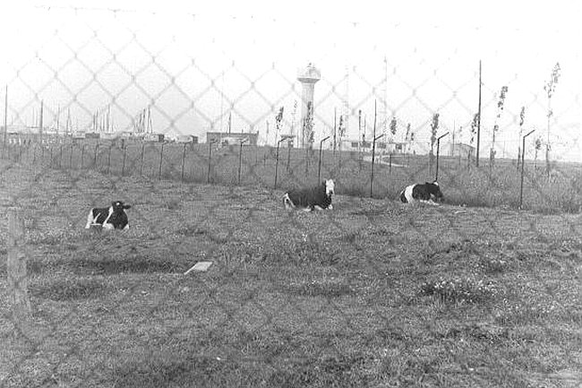 - Looking through the mesh fence at cows and the trailer park area - August 1955.
