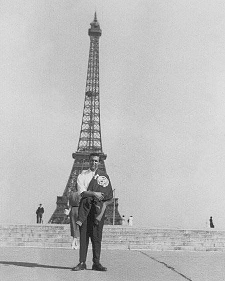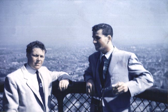 (L-R) Duke Perrier and Buck Marriotte on the Eiffel tower in Paris - September 1955.