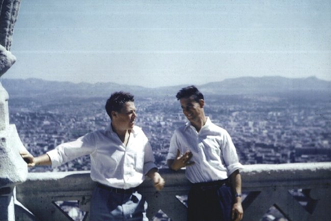 (L-R) Duke Perrier and Mile Parsons on top of a church tower somewhere in southern France - September 1955.