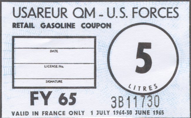 When a vehicle was registered under the AF system, the owner was entitled to purchase US Quartermaster Gas coupons. This enabled the owner of the vehicle to purchase gasoline at approximately 25 cents per gallon. The Quartermaster coupons were rationed on the basis of the size of the car as follows: