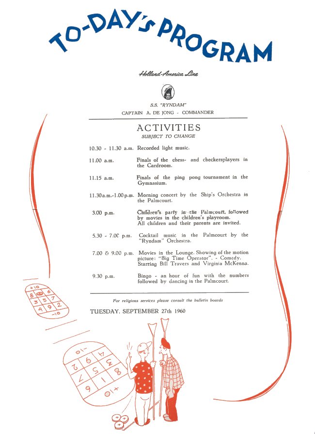 Heralded as one of 'The Economy Twins', the RYNDAM arrived at the crest of the postwar wave in steamship travel. With Tourist passage starting at 59 ($160), they were outstandingly successful. The RYNDAM developed a 'Friendly Ship' reputation appealing to budget vacationers, students, professors, emigrants, artist and cultural groups. The RYNDAM was an innovation in budget travel.