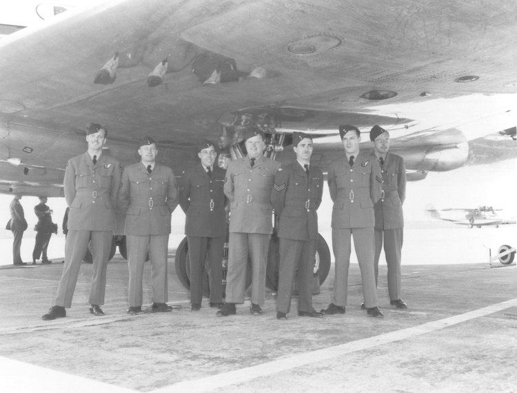 RCAF personnel gather under the wing of an RCAF Comet. Note the reflection on the wing.